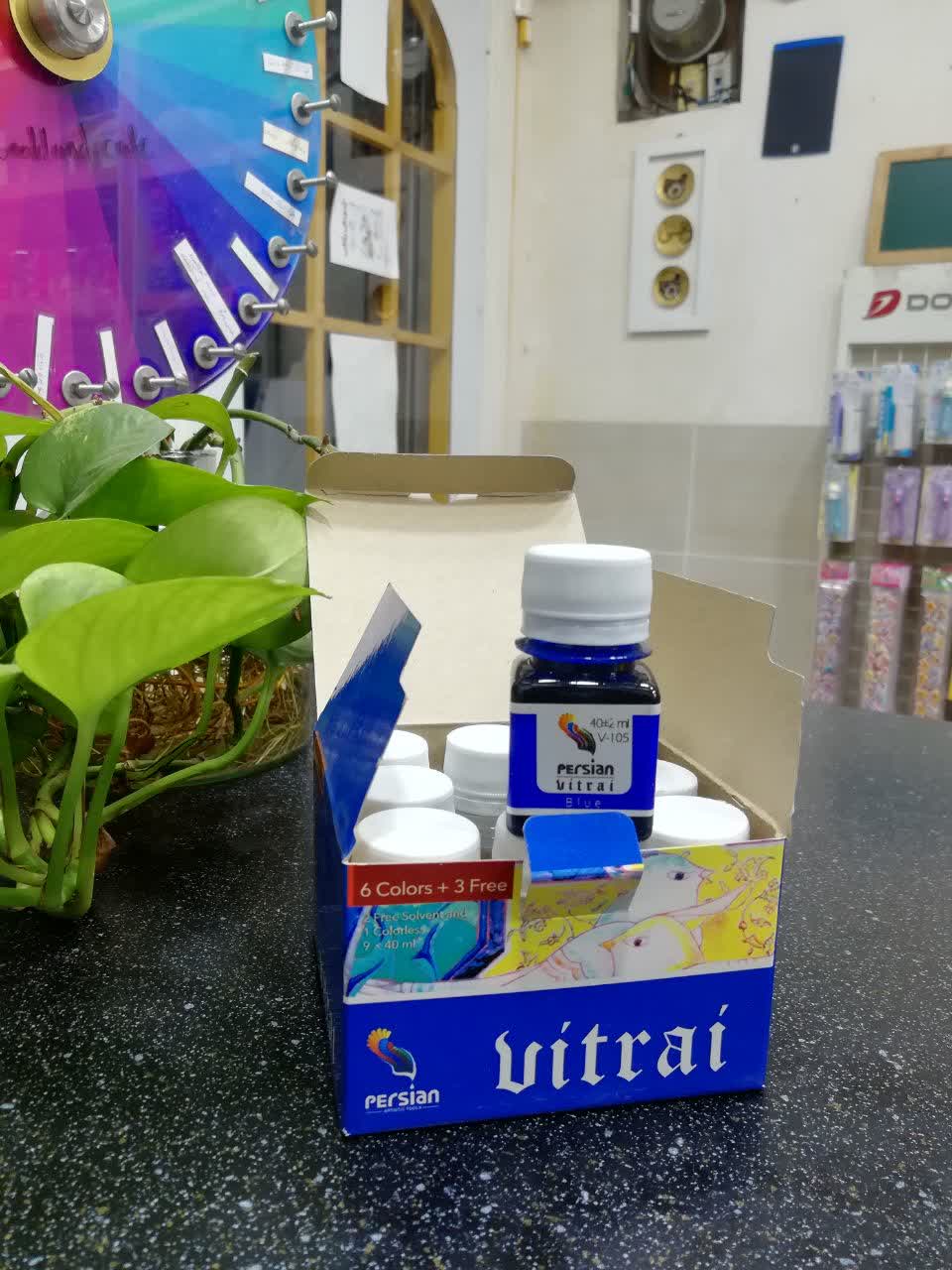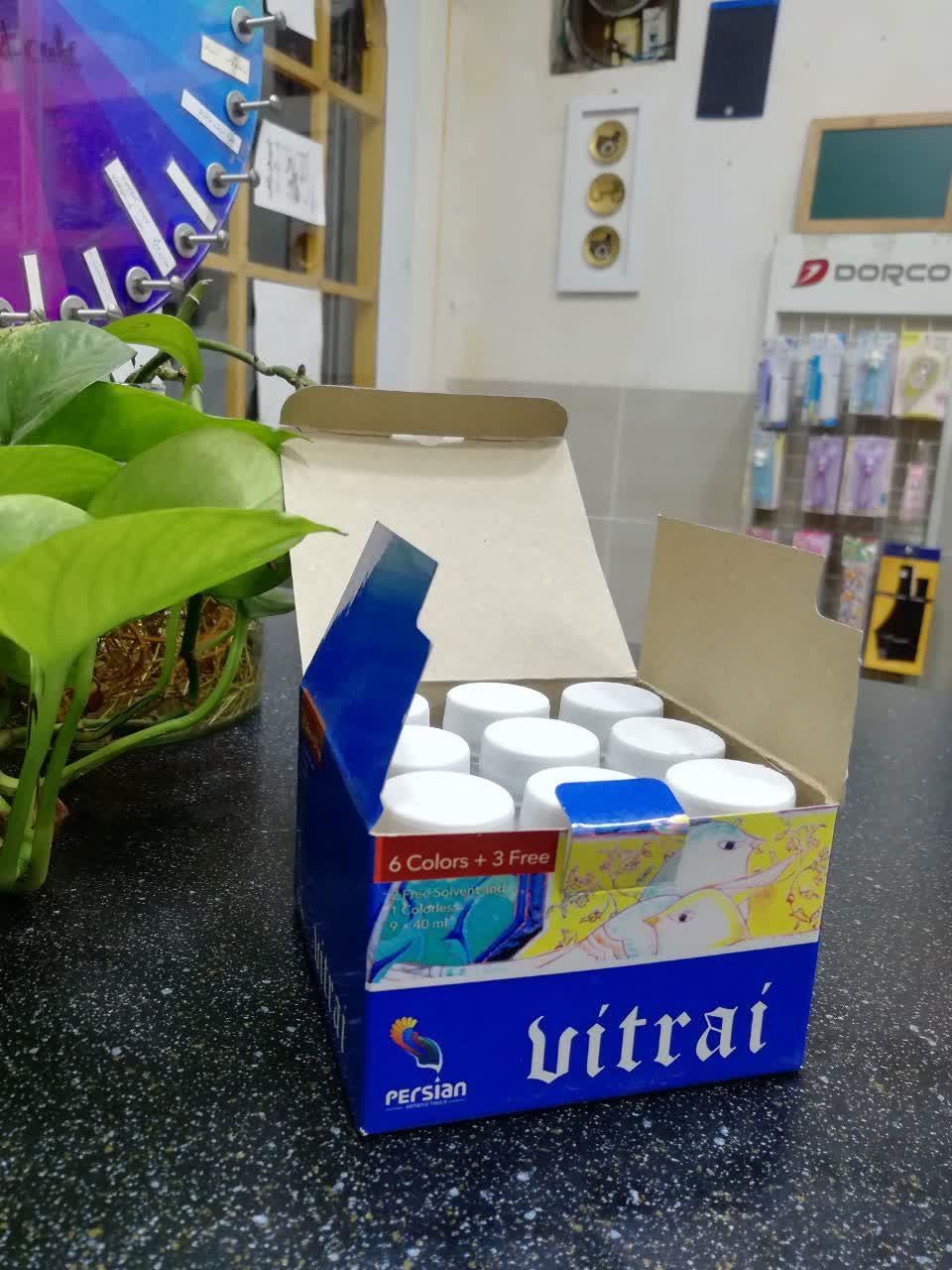 حجم هر بطری: ۴۰ میلیلیتر بسته ۹ عددی شامل: - ۶ رنگ: قرمز، مشکی، زرد، آبی، سفید، سبز - ۲ عدد حلال - ۱ عدد بدون رنگ قابل استفاده بر روی: - شیشه - سفال - کاشی و سرامیک مناسب برای هنرمندان و مبتدیان بدون نیاز به پخت و حرارتدهی قابل اشتعال